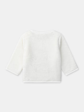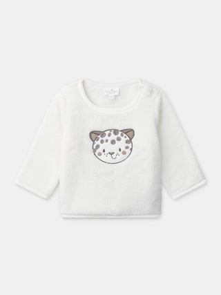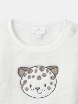 For a dynamic child, this outfit is perfect for cool days. The synthetic fur sweatshirt and the mottled fleece pants ensure warmth and comfort. The snow leopard embroidery adds a playful and wintry touch.